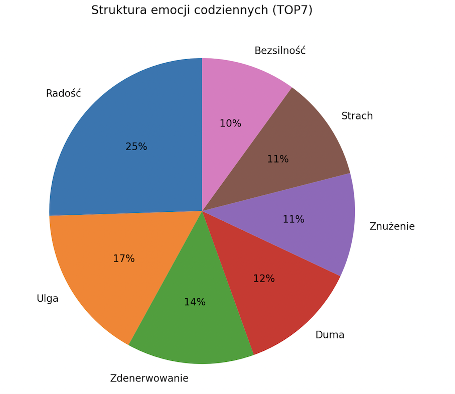 Wśród emocji codziennych dominują uczucia pozytywne: radość (51%) oraz ulga (33%). Jednocześnie zauważalny jest wysoki poziom emocji napięciowych, takich jak zdenerwowanie (27%) i strach (22%), co wskazuje na współwystępowanie komfortu psychicznego i przeciążenia.