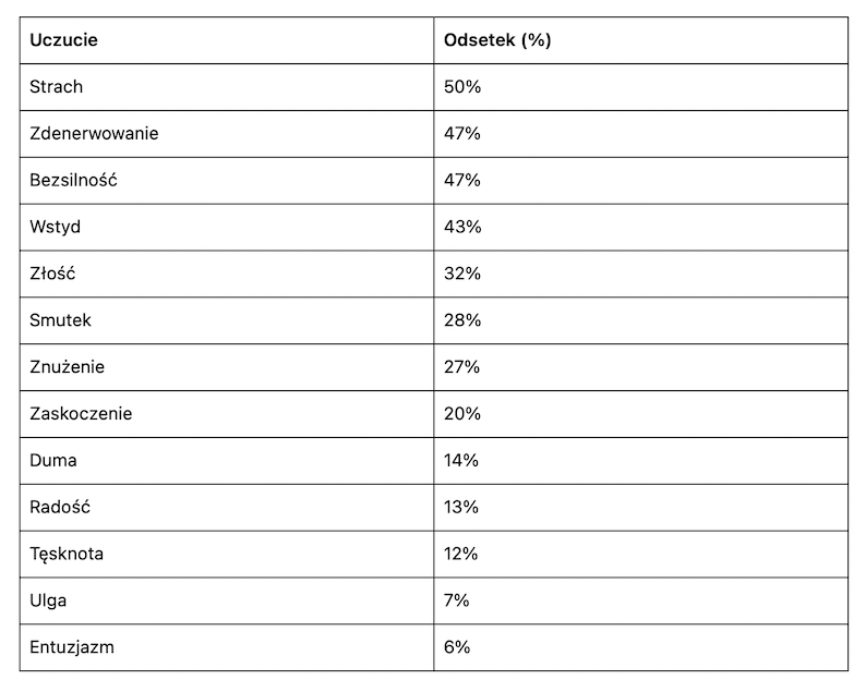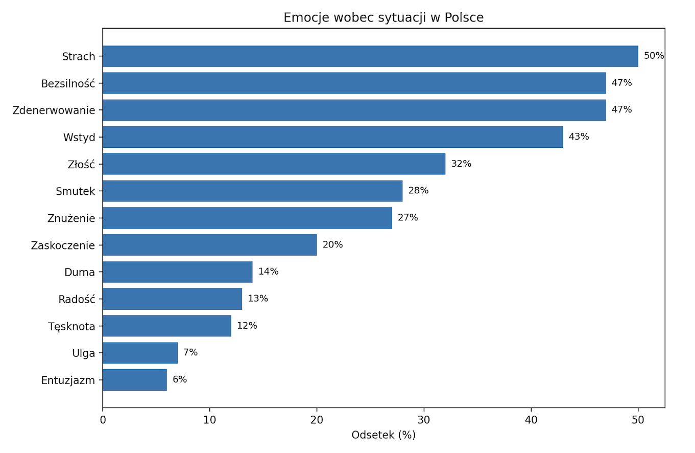 W kontekście sytuacji w Polsce wyraźnie dominują emocje negatywne: strach (50%), zdenerwowanie (47%), bezsilność (47%) i wstyd (43%). Pozytywne stany (radość, ulga, entuzjazm) są relatywnie rzadkie.