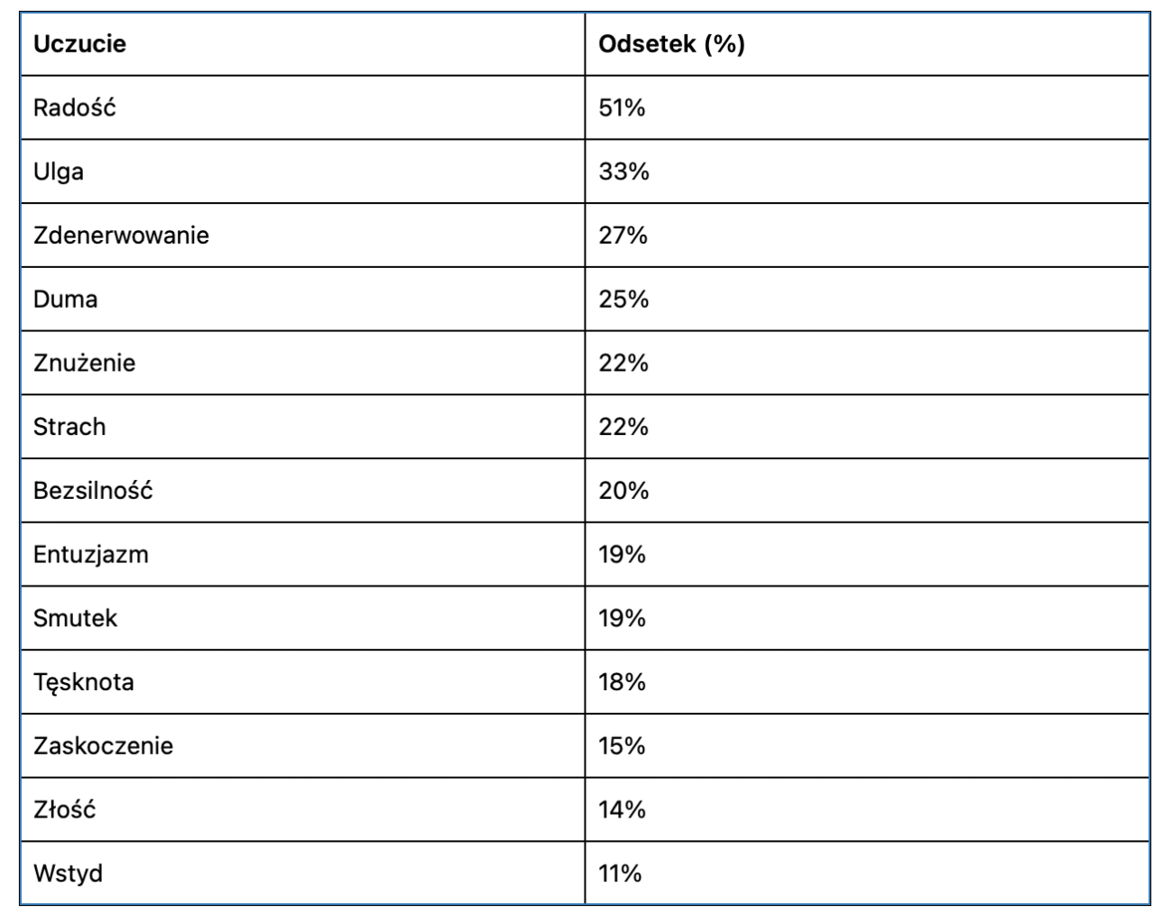 Hierarchia emocji pokazuje wyraźną przewagę stanów przyjemnych nad negatywnymi, jednak ich rozkład jest relatywnie spłaszczony – kilka emocji osiąga poziom powyżej 20%, co sugeruje zróżnicowane doświadczenia emocjonalne w populacji.